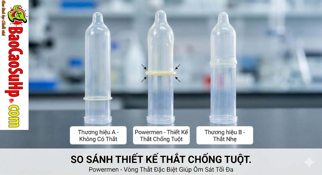- Thiết kế: Powermen sử dụng lằn thắt ôm sát, trong khi Durex và Sagami thường tích hợp cấu trúc tương tự nhưng đôi khi độ ôm khít không bằng.