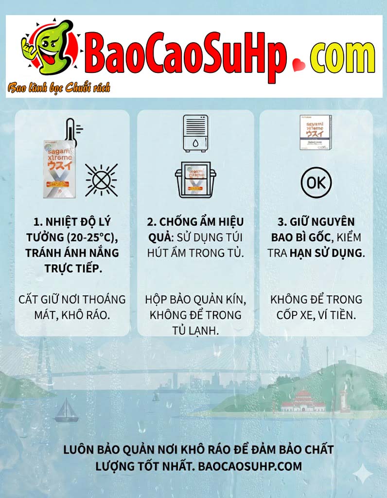 - Bao cao su cần được bảo quản ở nơi khô ráo, thoáng mát.