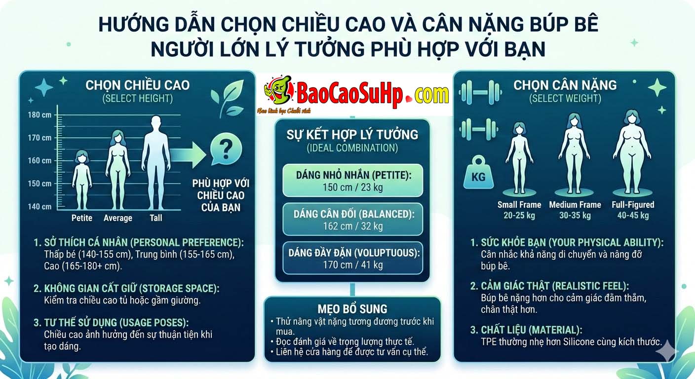 Việc chọn lựa búp bê tình dục không chỉ đơn giản là quyết định về mặt sở thích cá nhân mà còn phải cân nhắc các yếu tố liên quan đến chiều cao và cân nặng. Những con số này không chỉ ảnh hưởng đến trải nghiệm thực tế mà còn tạo nên sự thoải mái và dễ dàng trong quá trình sử dụng. Bạn sẽ ngạc nhiên khi biết rằng một vài cân nặng nhỏ nhặt cũng có thể thay đổi cách bạn cảm nhận và tương tác với búp bê của mình. Cùng tìm hiểu xem nên chọn chiều cao và cân nặng như thế nào là lý tưởng nhất nhé!