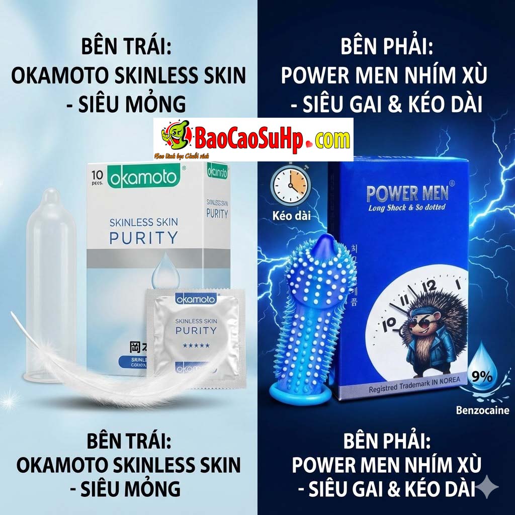 Okamoto Skinless Skin và Powermen Nhím Đen, mỗi loại mang đến những trải nghiệm khác biệt và thú vị. Okamoto là sự lựa chọn hoàn hảo cho những ai mong muốn sự tự nhiên và thoải mái, trong khi Powermen có thể là sự lựa chọn hàng đầu cho những cặp đôi ưa thích sự kích thích mạnh mẽ và khám phá những điều mới lạ trong cuộc sống tình dục. Cuối cùng, lựa chọn sản phẩm nào phụ thuộc vào sở thích và nhu cầu của từng cá nhân, nhưng hãy chắc chắn rằng sự lựa chọn của bạn mang lại sự thỏa mãn và an toàn tối đa.