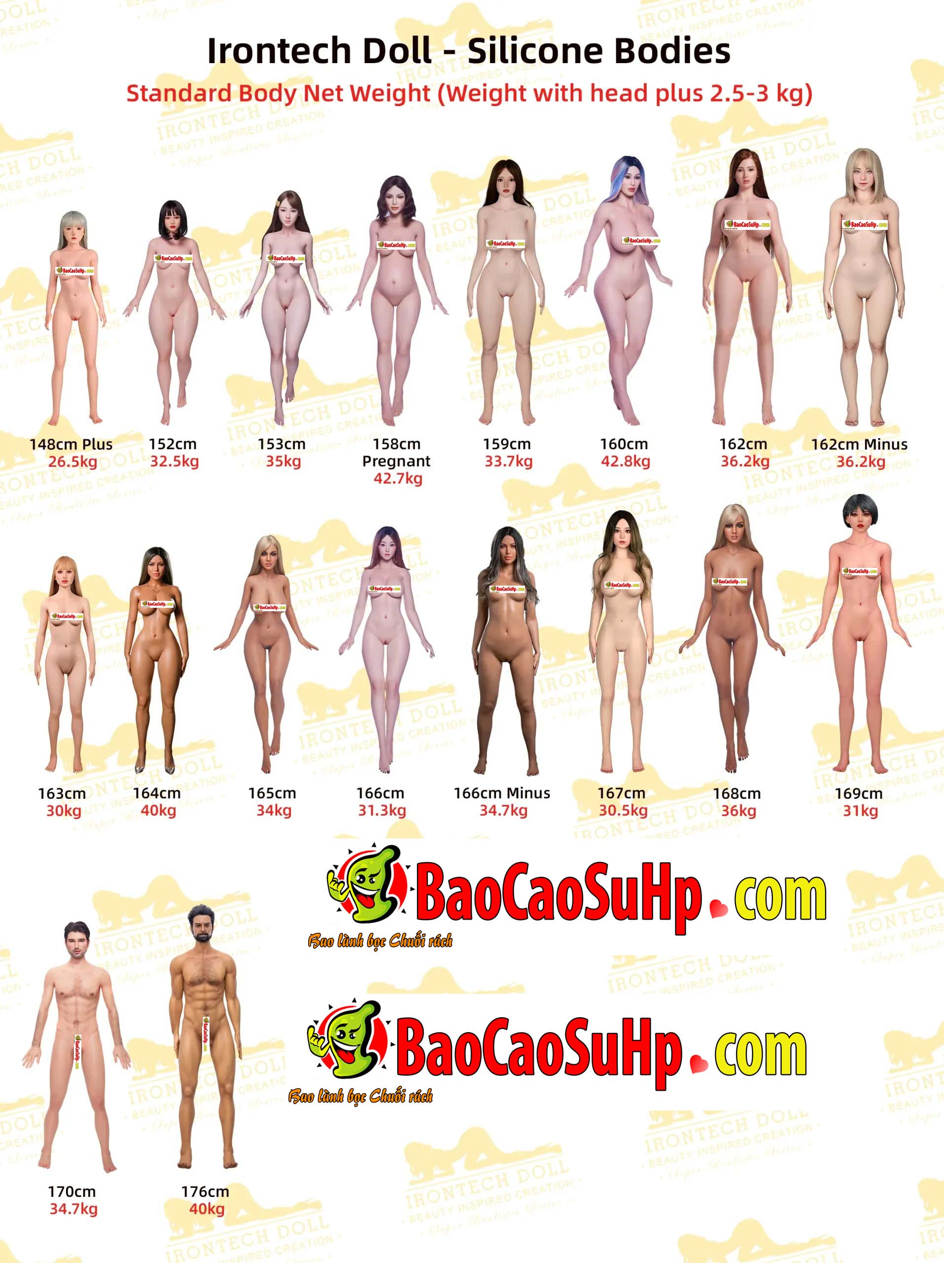Hiện tại, Irontech đã tìm được điểm cân bằng hoàn hảo giữa việc giảm tải trọng lượng và giữ độ chân thực. Trọng lượng búp bê silicone của chúng tôi đã được tối ưu hóa. Ở cấu hình tiêu chuẩn (sử dụng ngực Gel – loại ngực mềm mại nhất hiện nay), trọng lượng thực tế sẽ như bảng số liệu dưới đây.