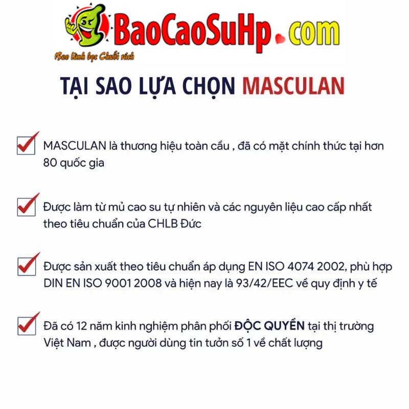 - Hương thơm độc quyền: Sản phẩm mang một hương thơm dịu ngọt, độc quyền của Masculan, giúp khơi gợi cảm xúc một cách tinh tế và khử đi mùi cao su khó chịu.