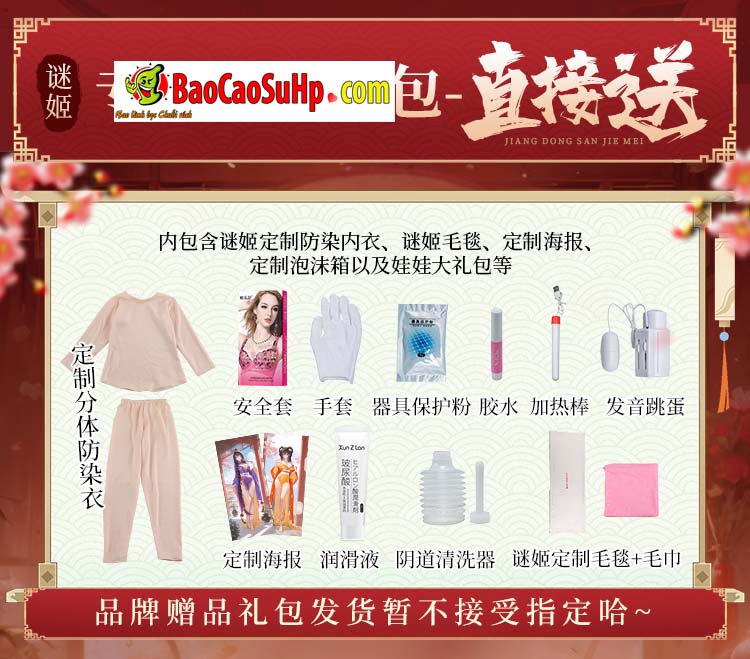 Nhà sản xuất tặng kèm một “Đại tiệc phụ kiện” cực khủng bao gồm: 1 bộ quần áo/nội y chống nhiễm màu thiết kế riêng, chăn lông mềm mại, găng tay, bao cao su, trứng rung, thanh sưởi nhiệt, phấn bảo dưỡng TPE, gel bôi trơn Axit Hyaluronic, dụng cụ thụt rửa vệ sinh và keo dán bảo dưỡng chuyên dụng.