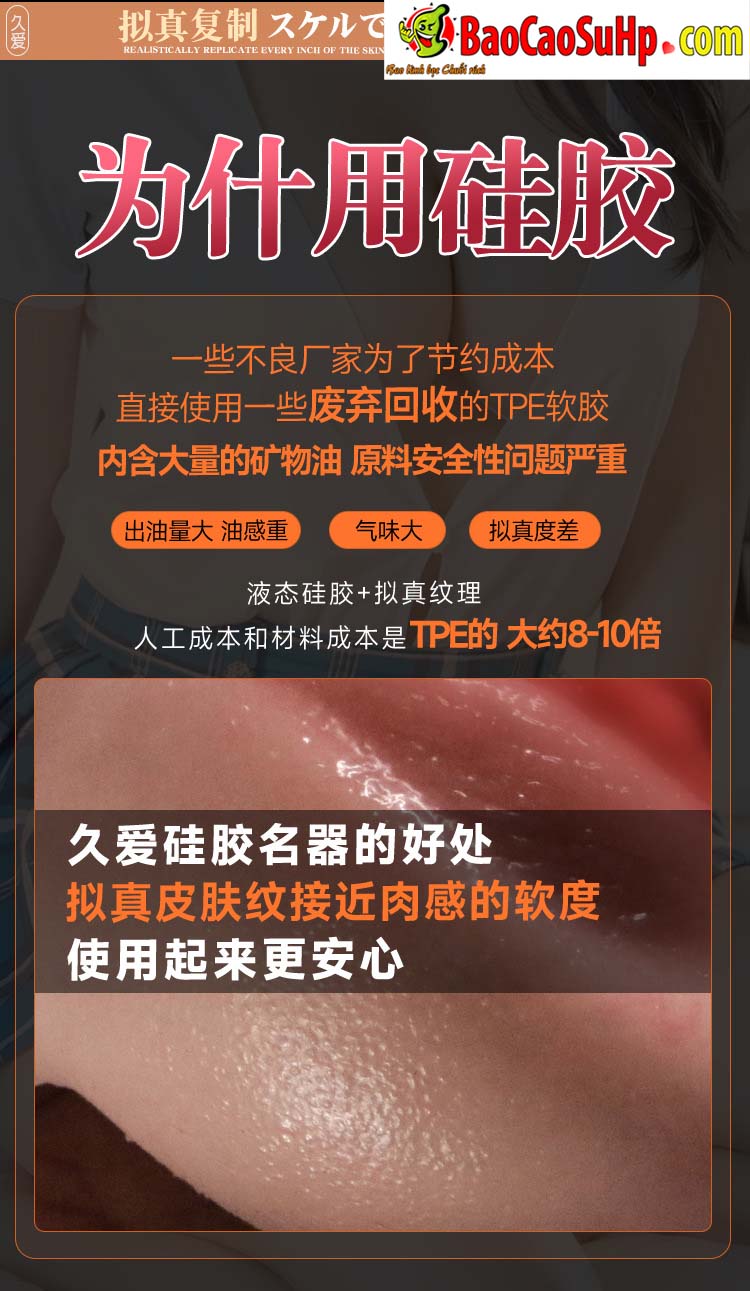 Jiuai không chỉ tạo ra một món đồ chơi, họ tạo ra một “bản sao” cơ thể. Với công nghệ Skin Texture Upgrade, bề mặt sản phẩm được xử lý nhám mờ (Matte), giúp loại bỏ hoàn toàn cảm giác dính dớp tay. Đặc biệt, công nghệ Blood Vessel Replica đúc ẩn các sợi gân máu dưới lớp da silicon, tạo nên một vẻ ngoài sống động, đầy sức sống như đang trong cuộc yêu thực sự.
