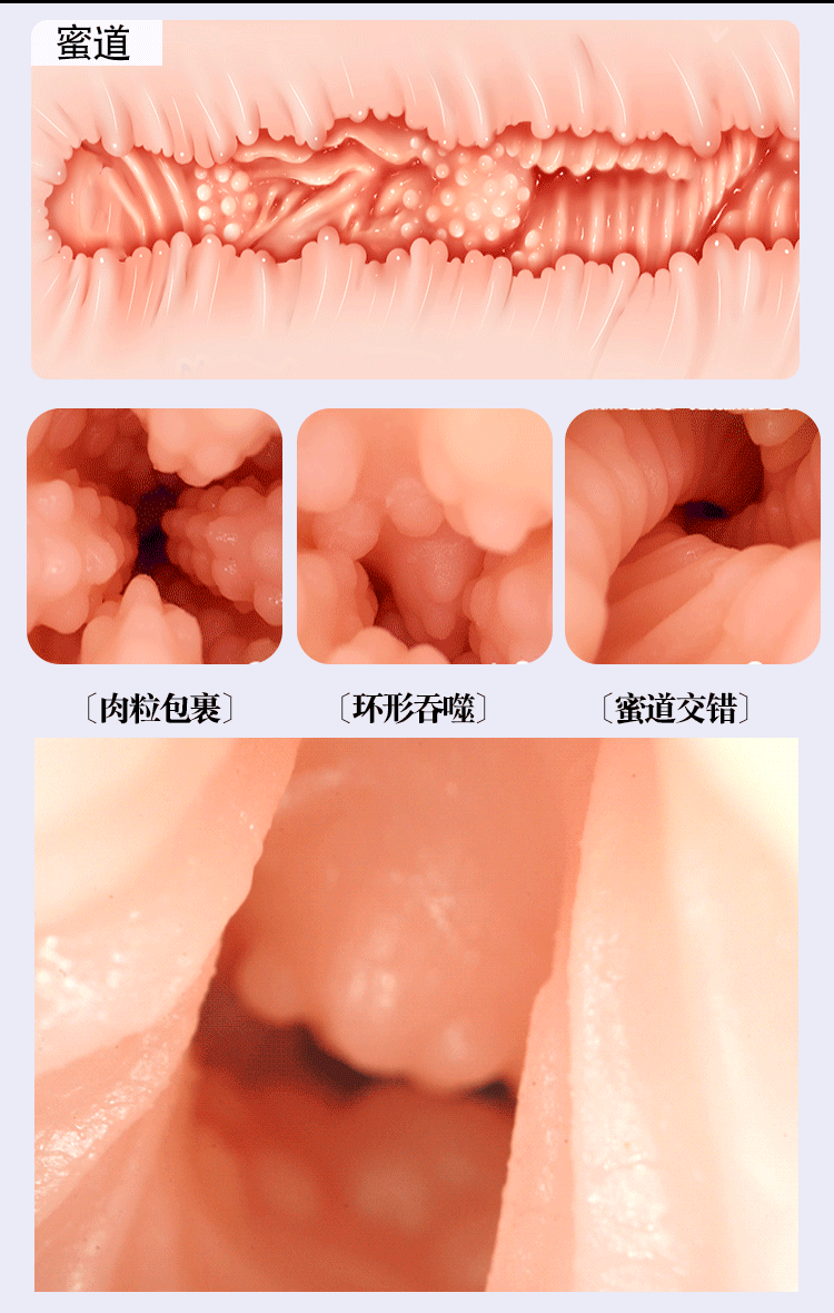 Đặc điểm: Mô phỏng tỉ mỉ môi lớn, môi bé và các nếp gấp tự nhiên. Bên trong là hệ thống hạt nổi và điểm G được bố trí đa tầng, mang lại cảm giác bao bọc, êm ái như nhung.