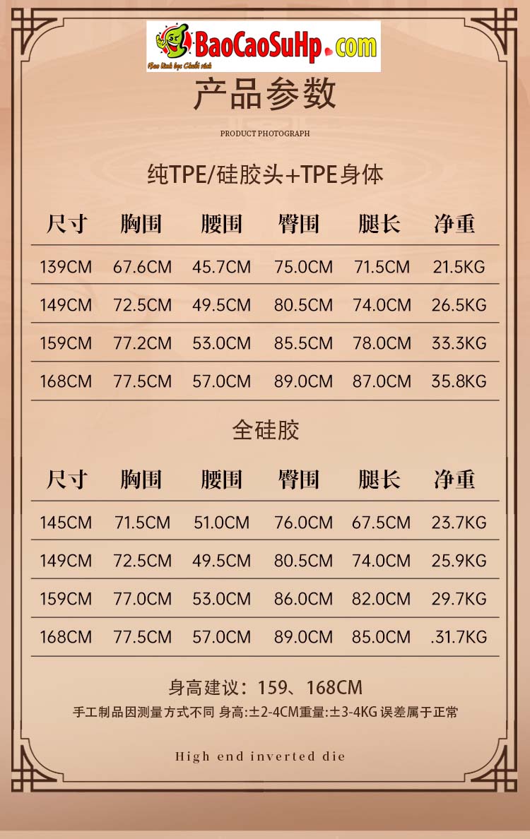 Chất liệu Full Silicone khắc phục hoàn toàn nhược điểm nhớp nháp, tiết dầu của các dòng búp bê rẻ tiền. Vẻ đẹp 2.5D siêu thực, không lo bị “già” đi theo năm tháng. Khung xương cứng cáp, chịu lực tì đè cực tốt. Độ bền sản phẩm có thể lên tới chục năm nếu chăm sóc đúng cách. Nhược điểm: Giá thành của Full Silicone khá đắt đỏ so với TPE. Cân nặng 28kg đòi hỏi anh em phải có chút thể lực khi bế bồng, di chuyển hay dọn rửa. Việc vệ sinh một cô nàng búp bê tỷ lệ 1:1 luôn cần sự kiên nhẫn và tỉ mỉ.