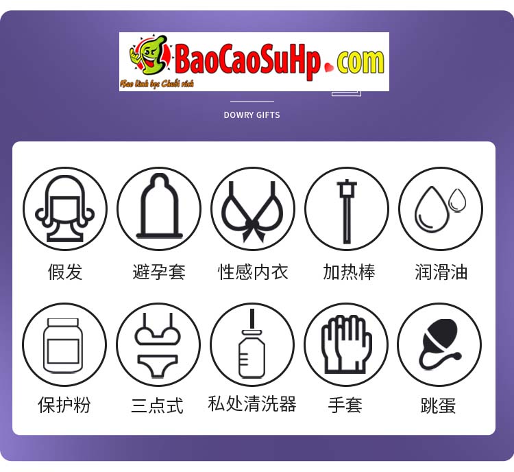 - Phụ kiện tặng kèm: Nhà sản xuất vô cùng hào phóng khi tặng kèm bộ quà tặng “hồi môn” bao gồm: Tóc giả, Bao cao su, Nội y gợi cảm, Thanh sưởi nhiệt, Gel bôi trơn, Phấn bảo dưỡng, Bộ 3 mảnh bikini, Dụng cụ rửa vùng kín, Găng tay và Trứng rung.