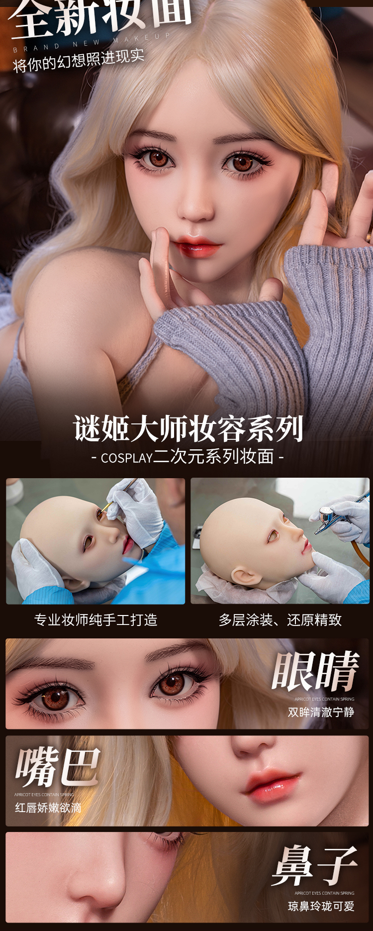 Ưu điểm: Độ chân thực cực cao (vân da, lỗ chân lông), không mùi, không ra dầu, dễ vệ sinh, rất bền, chịu nhiệt tốt hơn, trang điểm khuôn mặt tinh xảo và sắc nét hơn.