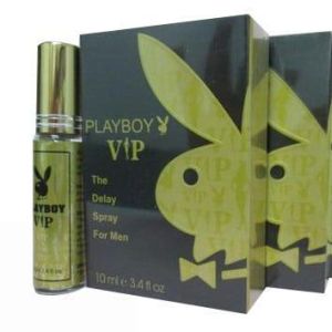 Vỏ hộp: Tông đen chủ đạo với logo Playboy ánh bạc/hologram sang trọng. Dòng chữ DURATION LIQUID và MALE GENITAL DESENSITIZER SPRAY được in sắc nét.