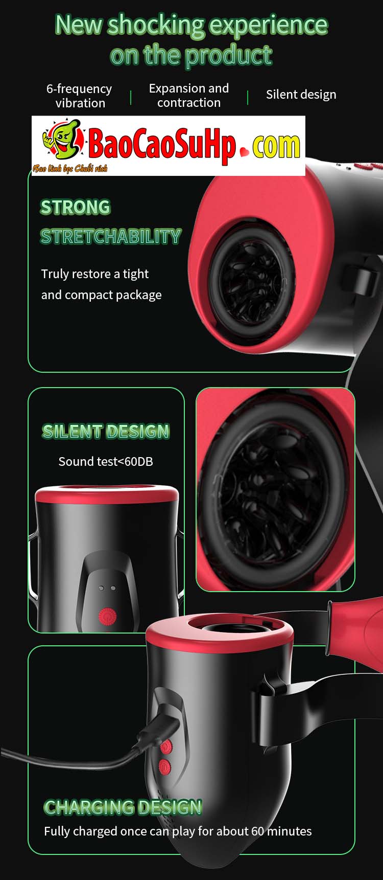 - Tính năng: 6 chế độ rung / thụt thò tự động (6-frequency vibration/expansion).