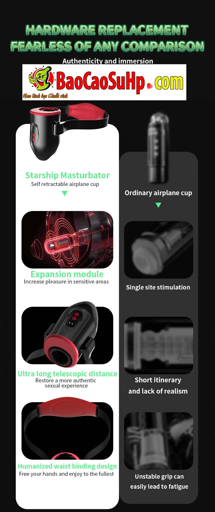 Sản phẩm được lấy cảm hứng từ những phi thuyền không gian (Starship) hiện đại, với mục tiêu phá vỡ sự nhàm chán của các loại cốc thủ dâm thông thường vốn chỉ kích thích được một điểm đơn điệu. Các nhà thiết kế thấu hiểu rằng việc phải liên tục dùng tay cầm nắm sẽ dễ gây nhức mỏi và làm giảm đi sự nhập tâm. Từ đó, hệ thống đai đeo hông (Waist binding design) ra đời, giúp giải phóng hoàn toàn đôi tay (Free your hands) để bạn có thể nằm thư giãn hoặc tự do kết hợp các tư thế khác.