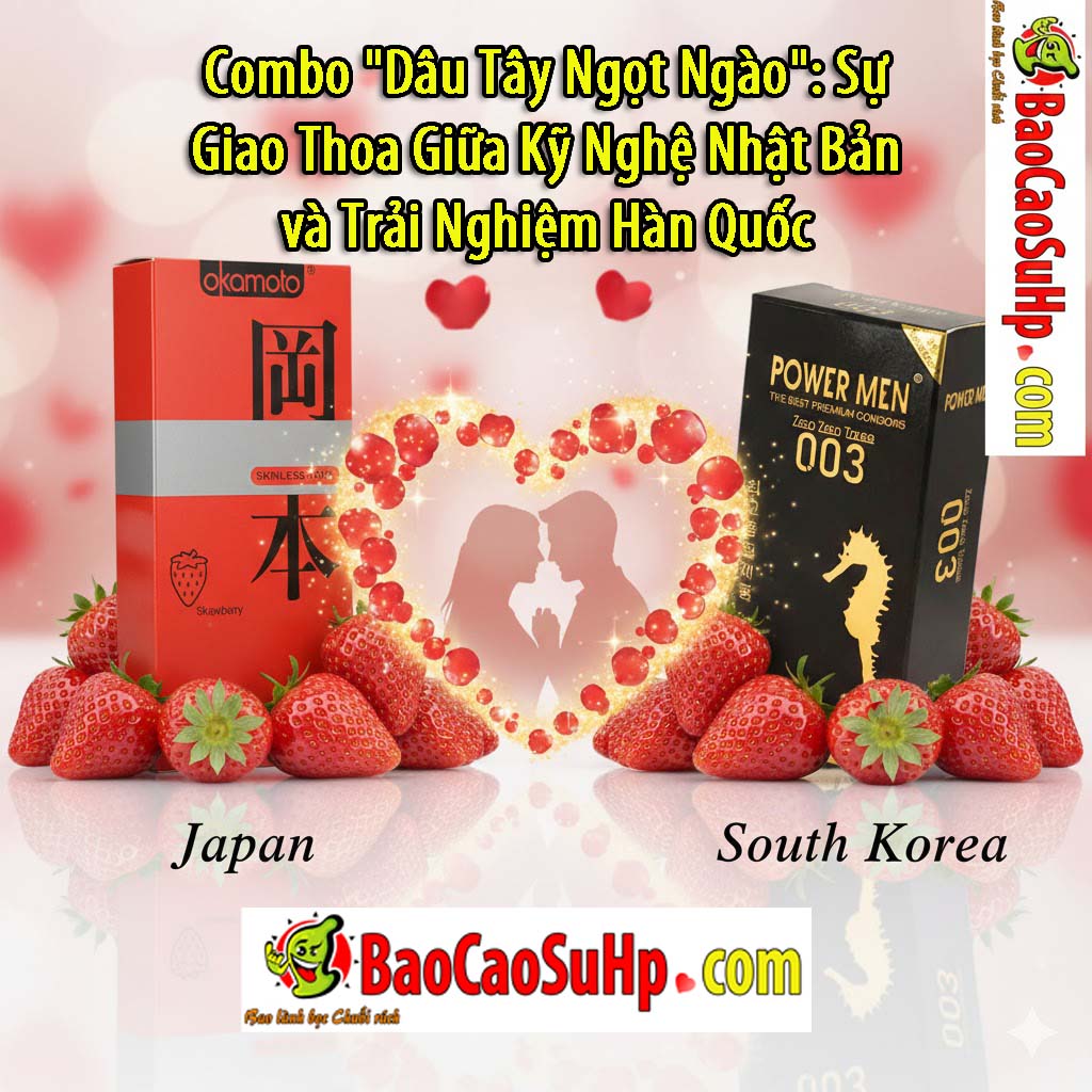 Khi nói đến hương dâu trong phòng the, người ta thường nghĩ đến sự lãng mạn và kích thích khứu giác. Tuy nhiên, combo bao cao su này không chỉ dừng lại ở mùi hương. Đây là sự kết hợp chiến thuật giữa Okamoto (Nhật Bản) – bậc thầy về độ mỏng, và Power Men (Hàn Quốc) – chuyên gia về cảm giác mạnh và kéo dài thời gian.