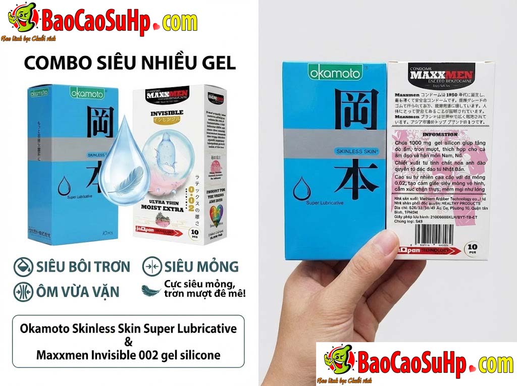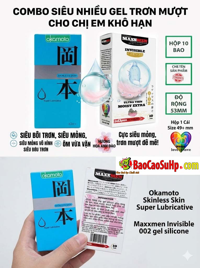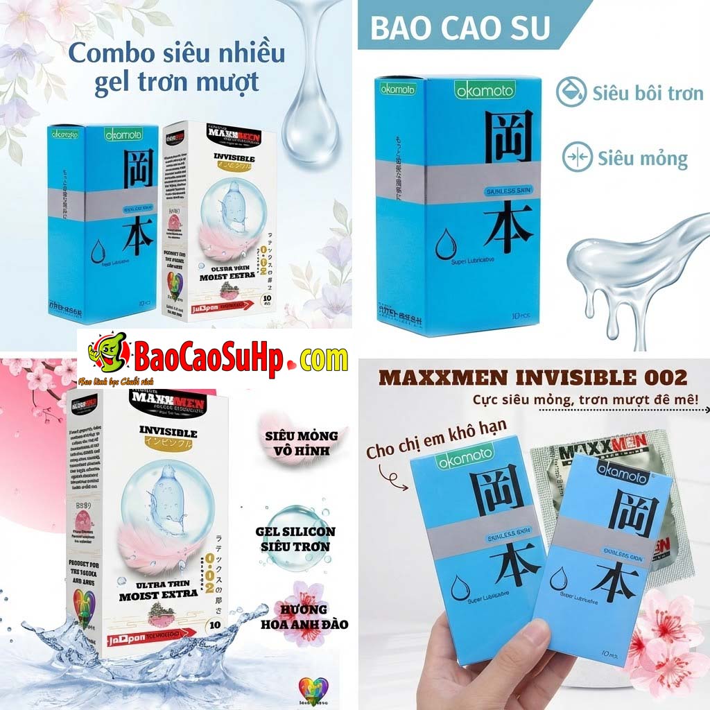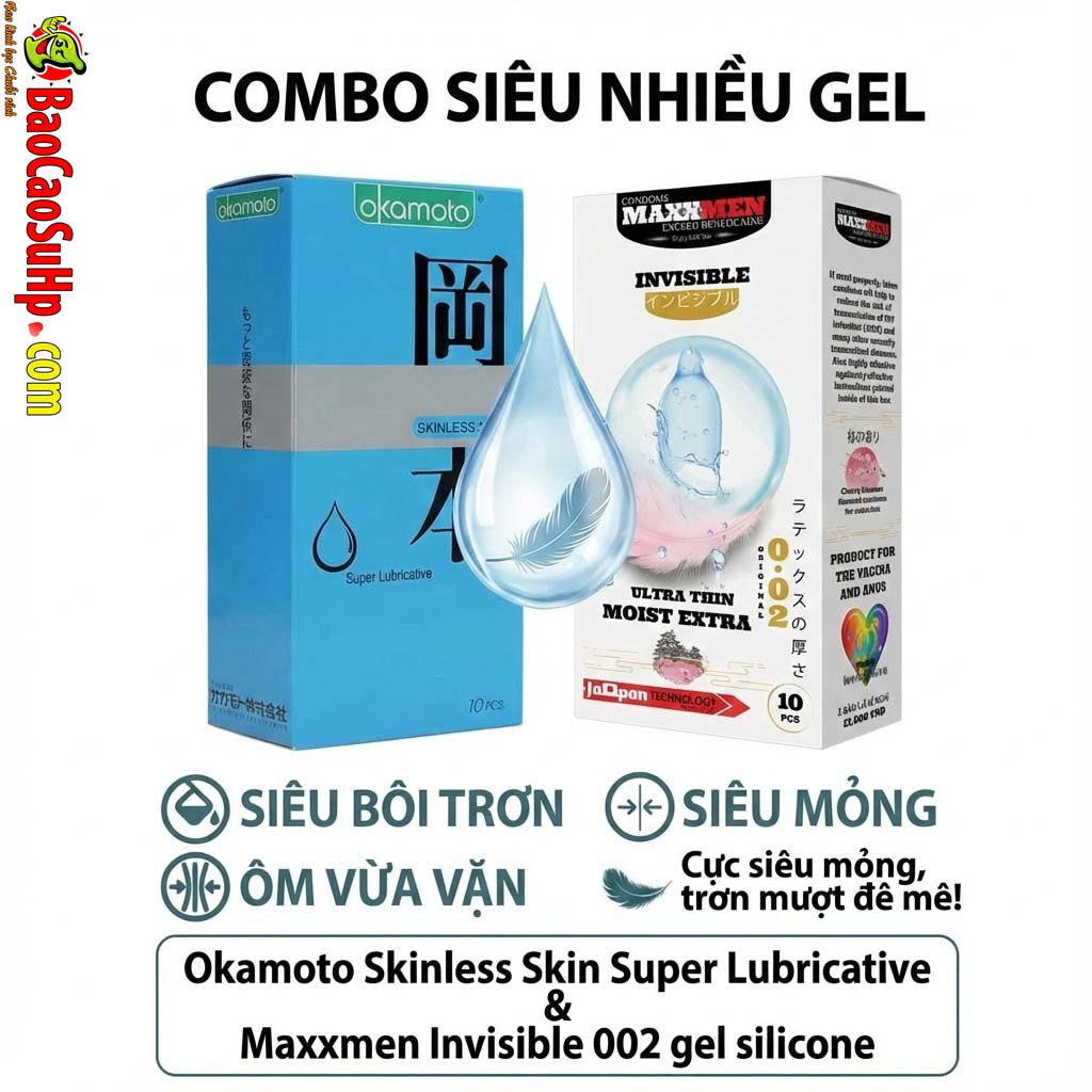 Combo bao cao su siêu nhiều gel trơn mượt cho chị em khô hạn Okamoto Skinless Skin Super Lubricative và Maxxmen Invisible 002 gel silicone
