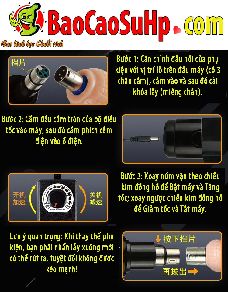 - Điều khiển: Xoay núm vặn trên bộ điều khiển theo chiều kim đồng hồ để bật máy (On) và tiếp tục xoay để tăng dần tốc độ thụt.