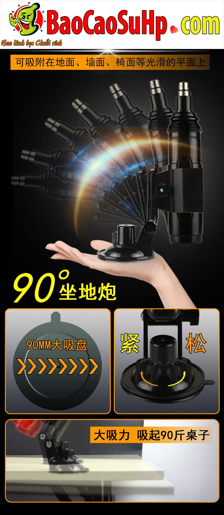 - Đế hút chân không “Quái vật”: Trang bị đế hút silicone cỡ lớn lên đến 9cm. Lực hút chân không cực mạnh này có thể bám chặt vào các mặt phẳng nhẵn như sàn nhà, tường phòng tắm, mặt ghế, thậm chí có khả năng nhấc bổng một chiếc bàn nặng tới 45kg (90 cân Anh).