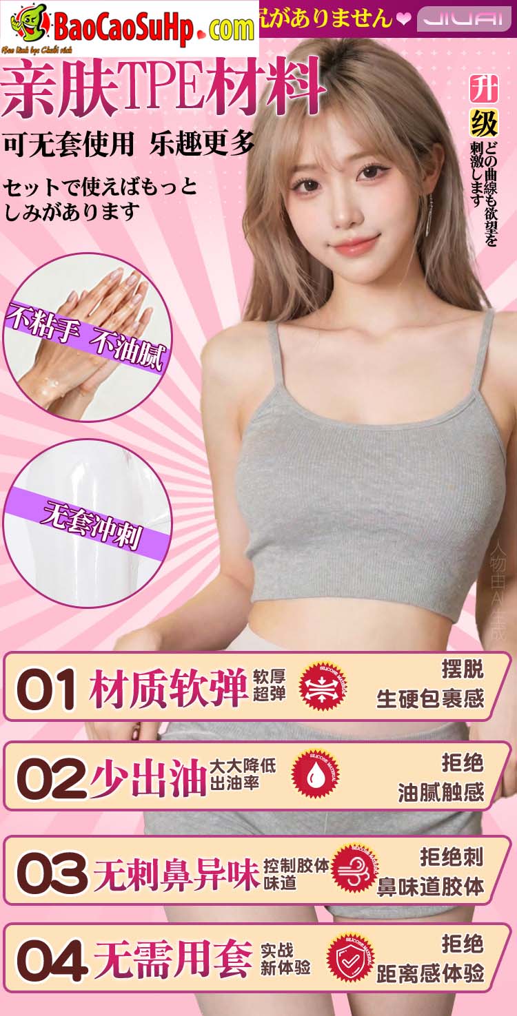 Sản phẩm được đúc nguyên khối bằng chất liệu Full TPE (Thermoplastic Elastomer) cao cấp. Đây là chất liệu thân thiện với làn da, mang lại độ mềm mại, đàn hồi và cảm giác chạm như thịt thật. Đặc biệt, nhà sản xuất Jiuai đã cải tiến công thức TPE giúp sản phẩm khắc phục được nhược điểm của các loại silicon/TPE thông thường: hạn chế tối đa việc tiết dầu nhờn, không dính tay và không có mùi hôi hóa học khó chịu.
