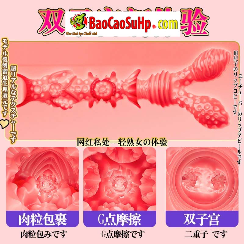 - Cấu trúc bên trong: Sản phẩm sở hữu thiết kế “lỗ kép” (Dual channels), cho phép trải nghiệm cả đường âm đạo và hậu môn. Đường hầm bên trong được bố trí vô số các nếp nhăn, hạt thịt nổi san sát nhau, tạo ra ma sát đa điểm (bao gồm cả mô phỏng điểm G) để tăng cường kích thích.