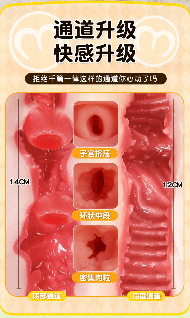 Kênh âm đạo (Mặt trước): Chiều dài 14cm. Đường hầm này cung cấp trải nghiệm kẹp và mút chặt chẽ. Cấu trúc bên trong được chia làm nhiều lớp: