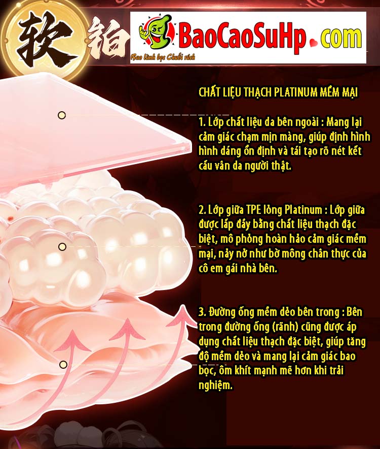 Lớp giữa (Jelly TPE Platinum): Được lấp đầy bằng vật liệu TPE dạng thạch lỏng bạch kim đặc biệt, mô phỏng hoàn hảo độ đàn hồi, nảy nở và mềm mại như bờ mông của một thiếu nữ.