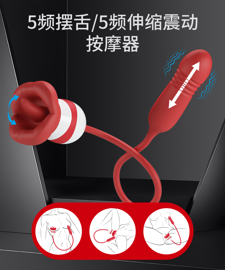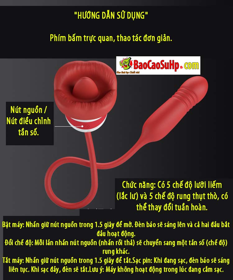 Đầu Lưỡi (Licking): Sở hữu 5 chế độ liếm/ngoáy. Chiếc lưỡi bên trong đôi môi silicon sẽ chuyển động nhịp nhàng, mô phỏng động tác oral sex điêu luyện lên hột le (âm vật) hoặc đầu ngực.