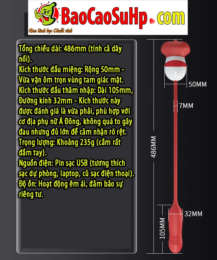 Kích thước đầu thâm nhập: Dài 105mm, Đường kính 32mm – Kích thước này được đánh giá là vừa phải, phù hợp với cơ địa phụ nữ Á Đông, không quá to gây đau nhưng đủ lớn để cảm nhận rõ rệt.